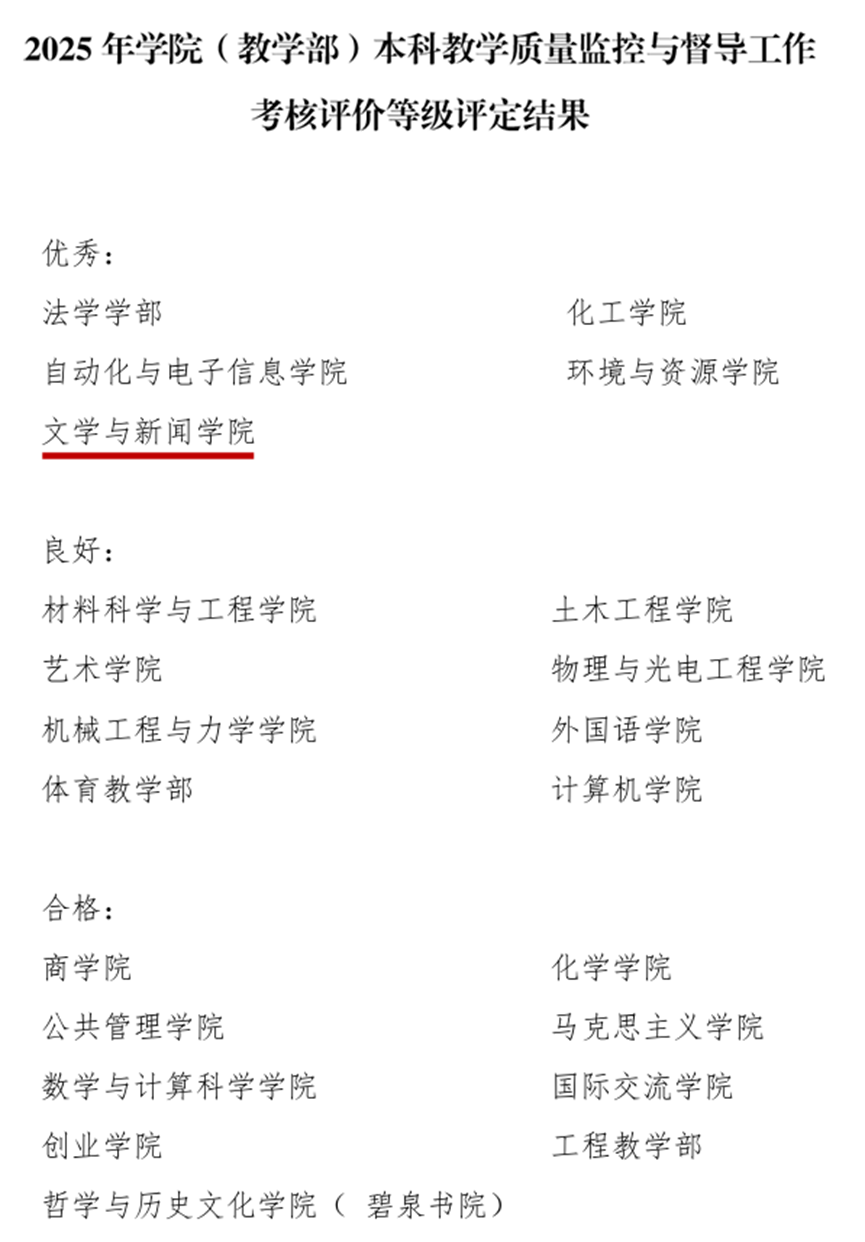 (教学部)本科教学质量监控与督导工作考核评价结果公布,我院凭借扎实的工作成效、完善的质量保障体系,再度获评“优秀”等级,实现连续两年获评优秀的佳绩。